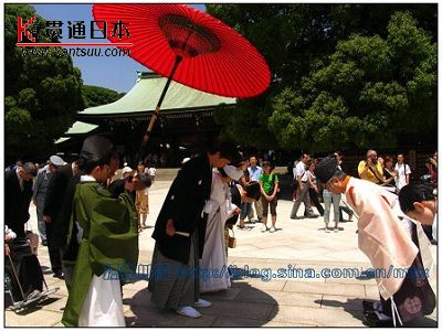 守护神社的神道使者有时会为日本新人举办传统婚礼,新郎、新娘和亲友团缓缓地从神社后殿走出,慢慢地绕过回廊走入正殿前的院落里,并在这里接受一身白袍的祭司的祝福,两边站有白色外套橙色裙子的巫女,礼毕后双方鞠躬道谢。 |