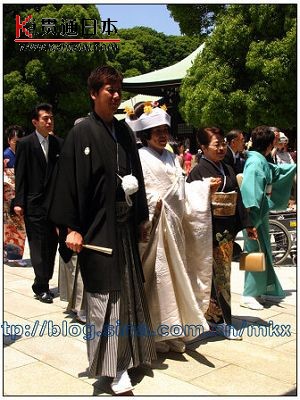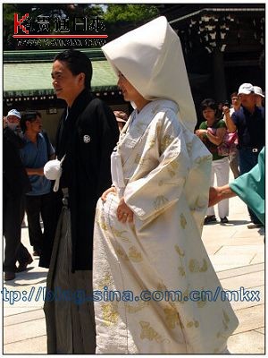 日本传统婚礼和它的本土宗教神道有着密切的关系。在日本,神道负责和“开始”有关的事务,例如结婚,生子等等。佛教负责和“结束”有关的事务,例如葬礼。图中身着白袍的男女都是神道的神职人员。 |