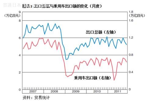 如图表3所示,大地震后,日本汽车的出口大幅下滑。金融危机前,日本汽车出口额几乎每月都超过1万亿日元。受金融危机影响,2009年首次跌到3000亿日元左右。与高峰期相比,实际已经下跌3/4。