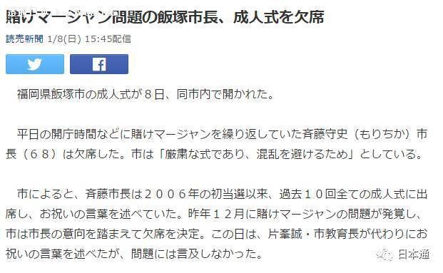 1月7日~9日是日本的成人节,日本各地为新的成人(满20岁的年轻人们)举办成人式。大家盛装出席仪式,一般都要听市长致辞,然而福冈县饭塚市的市长却因为爱打“赌钱麻将”不出席该市成人式。
