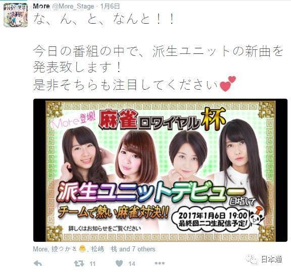 对麻将真的爱得深沉! 麻将偶像 专注生产美少女偶像团体的日本人告诉我们,什么都可以拿来组成偶像。无论是五六十岁的大阪大妈,还是200斤的超重少女,只要开心,大家都可以来组成组合然后出道呀。 这份热爱麻将的激情无处宣泄的时候,日本人又想着把麻将和美少女结合在一起,于是麻将偶像组合More就在2015年12月12日诞生了。
