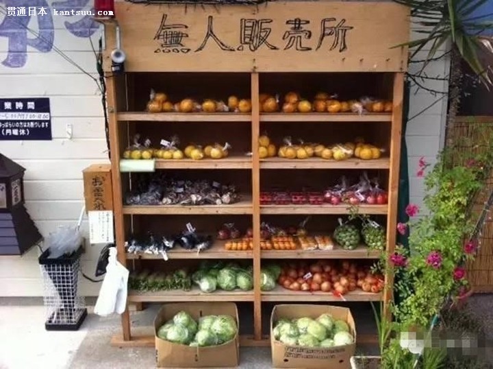 这是日本街头的无人值守的蔬菜贩卖架,自己拿菜,自己投钱,没有监督,一切自主完成。