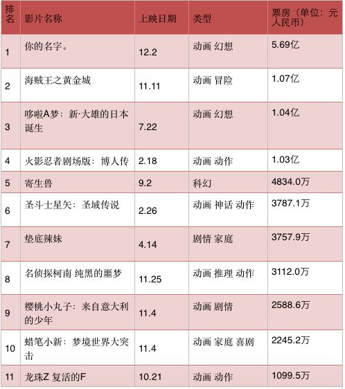 2016年日本电影内地票房榜 《你的名字。》以5.7亿的成绩再创日本引进片票房新高,在2016年的日影引进票房榜上,二三四名也被动画瓜分,分别是《航海王之黄金城》(1.07亿)、《哆啦A梦:新·大雄的日本诞生》(1.04亿)、《火影忍者剧场版:博人传》(1.03亿)。 而榜单第五名则是在《银魂》前,登顶引进日本真人电影票房冠军的《寄生兽》(4834万元)。