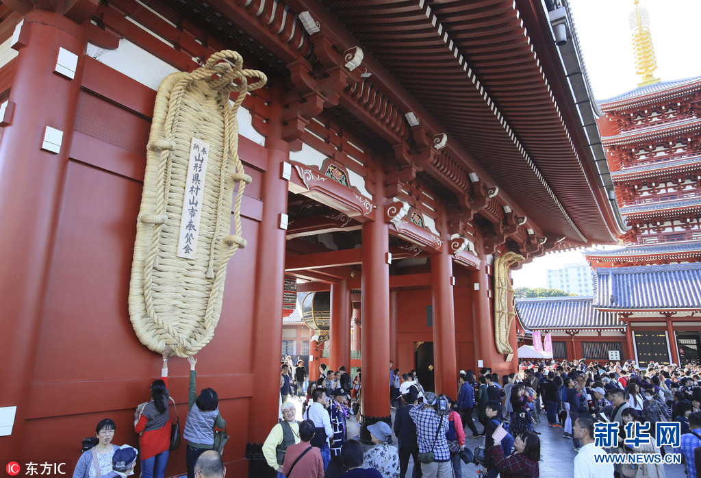 原标题:日本浅草寺悬挂500公斤巨型草鞋 用以驱魔辟邪(图)