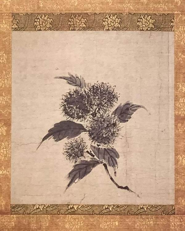 “蒙流九条袈裟”(部分),江月宗玩所用,江户时代,17世纪 3/21~4/21展出 牧溪和他的《六柿图》 据相关研究文章,比起“刘李马夏”、同为南宋画家的牧溪(牧谿),在中国美术史中的知名度并不大,关于他生平的记载不多。其作品《观音·猿·鹤图》三幅中有牧溪现今仅存的落款——“蜀僧法常谨制”,由此可以推断牧溪生于四川。 或因其画作过于自由,虽然元代画史著作《画继补遗》中对牧溪的评价为“僧法常,自号牧溪。善作龙虎、人物、芦雁、杂画,枯淡山野,诚非雅玩,仅可僧房道舍,以助清幽耳。”然而,明代大鉴藏家项元汴藏有牧溪水墨画花卉翎毛一卷,后来入于清宫。项元汴的题跋开始为牧溪翻案:“皆随笔点墨而成,意思简当,不假妆饰。余仅得墨戏花卉蔬果翎毛巨卷。其状物写生,殆出天巧。不惟肖似形类并得其意。京爱不忍置,因述其本末,以备参考。” 但传于日本的元代画家吴太素所著《松斋梅谱》中评价牧溪的绘画“皆随笔点墨而成,意思简当,不费装缀。”牧溪甚至被评为“日本画道的大恩人”。其画笔墨淋漓,颇具禅意。虽在中国不被欣赏,其洒脱不拘泥于形式的风格反而在日本备受推崇,他的现存作品也多收藏于日本。(文末附牧溪代表作及其收藏地)