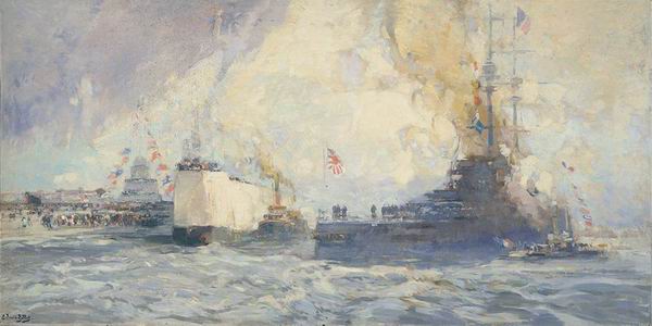 Lycian Simon,《公墓中的女子》,1918年,水彩,日本国立西洋美术馆(松方旧藏) 船舶和海洋主题的作品也是早期松方收藏的特色之一,这些作品除了表达了松方对造船的专业兴趣外,也通过海战、沉船,以及1921年的日本裕仁皇太子乘船访欧等作品记录了其关注着正在发生的历史。