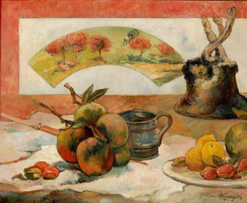 高更,《有扇子的静物》,1889年,油彩,法国奥塞博物馆藏 1921年至1922年是松方收藏的飞跃期,松方的名字也在巴黎画廊和收藏界传开,他一件接一件地购买艺术家的重要作品。在此期间还参观了莫奈吉维尼工作室,并收藏了马奈、雷诺阿、高更、凡高等印象派画家的作品。1921年8月左右,松方访问了德国和瑞士,收藏了蒙克等人的作品,并在柏林购买了17件大型挂毯。1922年至1923年,松方又成功地从哥本哈根商人收藏中获得了34件重要的现代绘画作品。
