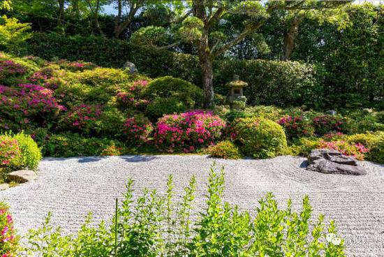 金福寺的枯山水庭院主要由白砂布置而成,背靠假山,风格简单质朴,使观者内心平静,而待花开之时,砂石的洁白与杜鹃的艳丽又形成强烈的反差,美得炫目。
