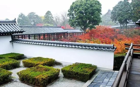 东福寺取奈良东大寺和兴福寺的头两字为名,称为东福寺。东福寺体现了禅宗建筑风格,寺内的东西南北建有风格迥异的方丈庭园,其中以北庭最为著名。寺内的洗玉涧通天桥,每到秋季,便成为京都观赏红叶的最佳观景地。