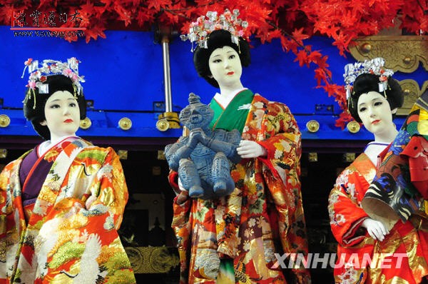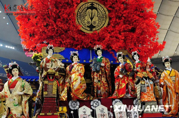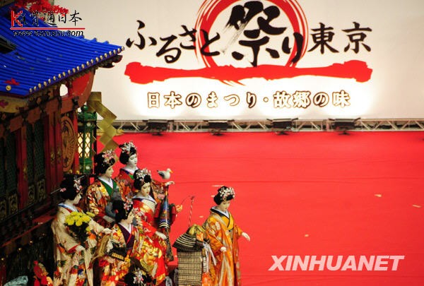 1月9日,东京棒球场内,日本青森县八户市展出的花车的和服人偶栩栩如生。2010年1月8日至11日,日本“故乡节”在东京棒球场举办,日本冲绳、秋田、青森等地的独特节日庆祝活动被搬到东京棒球场内,欣赏极具地域特色的庆祝仪式之余,观众们还可以遍尝日本全国各地的美味小吃。热闹的气氛不亚于我们中国人逛庙会。新华社记者华义摄