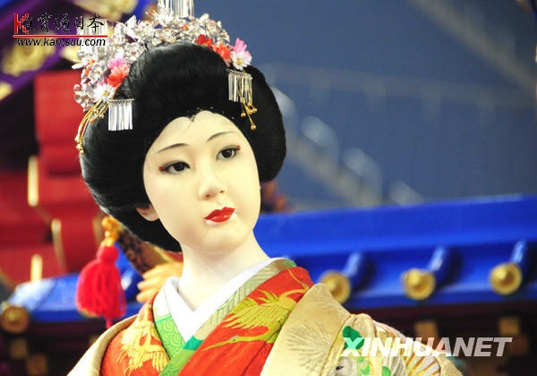 1月9日,东京棒球场内,日本青森县八户市展出的花车上“站放”着好几个真人大小的和服人偶,美貌逼真。2010年1月8日至11日,日本“故乡节”在东京棒球场举办,日本冲绳、秋田、青森等地的独特节日庆祝活动被搬到东京棒球场内,欣赏极具地域特色的庆祝仪式之余,观众们还可以遍尝日本全国各地的美味小吃。热闹的气氛不亚于我们中国人逛庙会。新华社记者华义摄