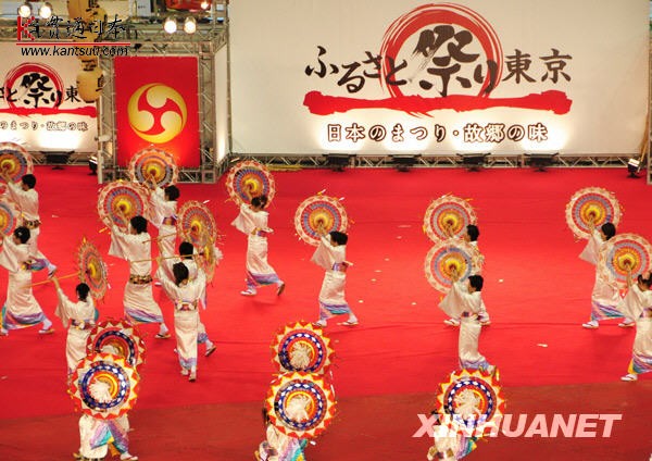 1月9日,东京棒球场内,鸟取县的演员们表演伞舞。2010年1月8日至11日,日本“故乡节”在东京棒球场举办,日本冲绳、秋田、青森等地的独特节日庆祝活动被搬到东京棒球场内,欣赏极具地域特色的庆祝仪式之余,观众们还可以遍尝日本全国各地的美味小吃。热闹的气氛不亚于我们中国人逛庙会。新华社记者华义摄