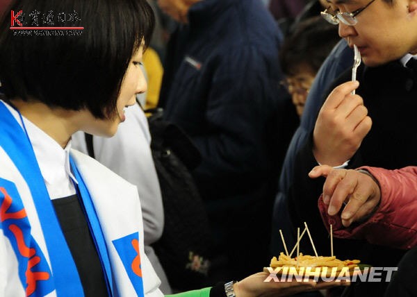 1月9日,东京棒球场内,一名出展者向游客推荐美食。2010年1月8日至11日,日本“故乡节”在东京棒球场举办,日本冲绳、秋田、青森等地的独特节日庆祝活动被搬到东京棒球场内,欣赏极具地域特色的庆祝仪式之余,观众们还可以遍尝日本全国各地的美味小吃。热闹的气氛不亚于我们中国人逛庙会。新华社记者华义摄