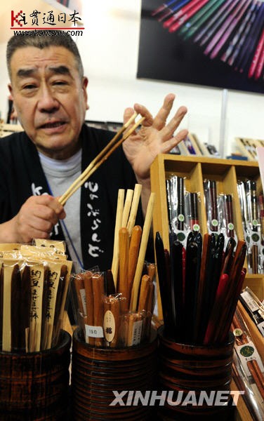 1月9日,东京棒球场内,一名制作筷子的老者向记者展示自己现场制作筷子的原料。2010年1月8日至11日,日本“故乡节”在东京棒球场举办,日本冲绳、秋田、青森等地的独特节日庆祝活动被搬到东京棒球场内,欣赏极具地域特色的庆祝仪式之余,观众们还可以遍尝日本全国各地的美味小吃。热闹的气氛不亚于我们中国人逛庙会。新华社记者华义摄
